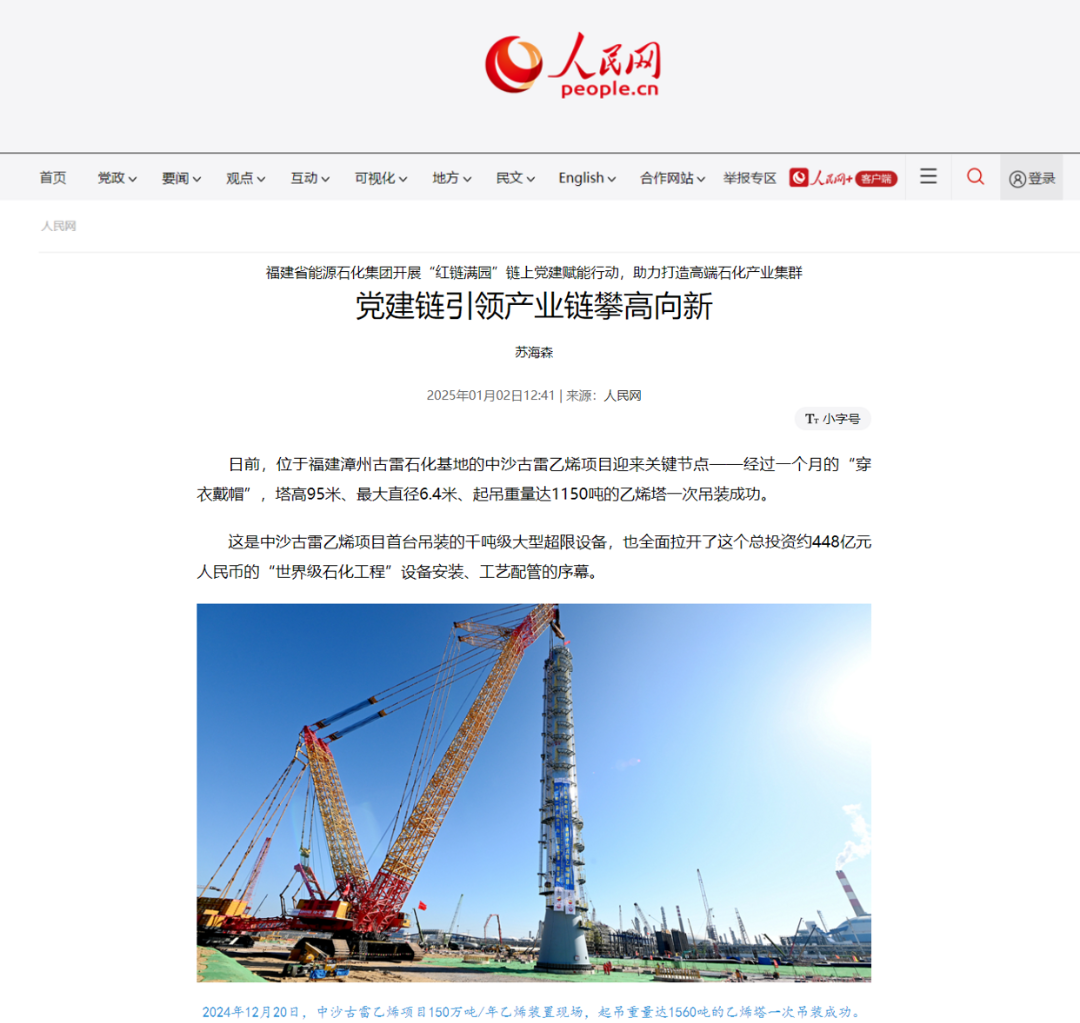 1月2日,人民網、“人民網 ”客戶端等多個平臺刊登《福建省能源石化集團開展“紅鏈滿園”鏈上黨建賦能行動,助力打造高端石化產業集群 黨建鏈引領產業鏈攀高向新》一文,全文如下——
