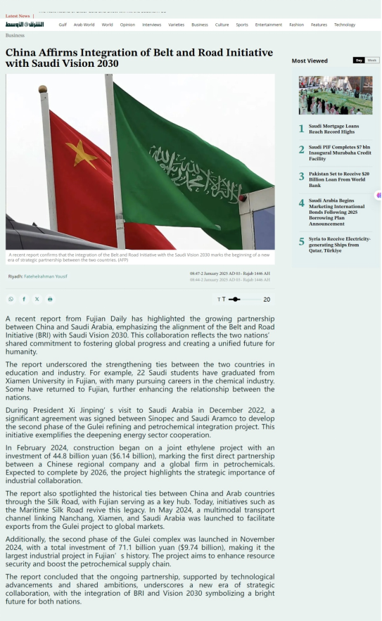 2024年2月,投資448億元人民幣(合61.4億美元)的中沙古雷乙烯項目開始建設,這是中國區域性公司與全球石化公司之間的第一次直接合作。該項目預計將于2026年完成,突出了產業合作的戰略重要性。該報道還強調了中國與阿拉伯國家通過絲綢之路的歷史聯系,福建是一個重要樞紐。如今,海上絲綢之路等倡議再次發揚了這一傳統。2024年5月,連接南昌、廈門和沙特阿拉伯的多式聯運通道開通,促進了古雷石化項目向全球市場的出口。
